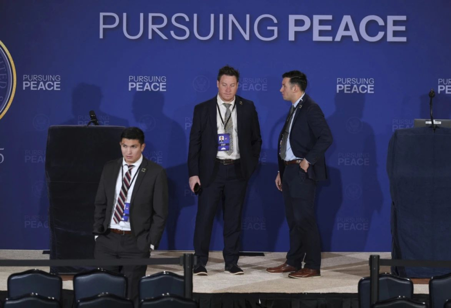 Səhnənin iki tərəfində ABŞ və Rusiya bayrağı yerləşdirilib.