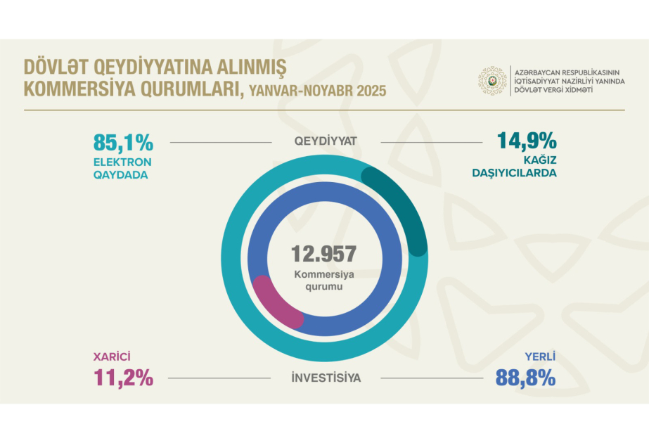 2025-ci ilin yanvar-noyabr aylarında 12 min 957 kommersiya qurumu dövlət qeydiyyatından keçib ki, onların 88,8 faizi yerli investisiyalı, 11,2 faizi xarici investisiyalıdır. Kommersiya qurumlarının 85,1 faizi elektron qaydada qeydiyyata alınıb. Yerli investisiyalı məhdud məsuliyyətli cəmiyyətlərin e-qeydiyyatının xüsusi çəkisi 96,4 faiz təşkil edib.