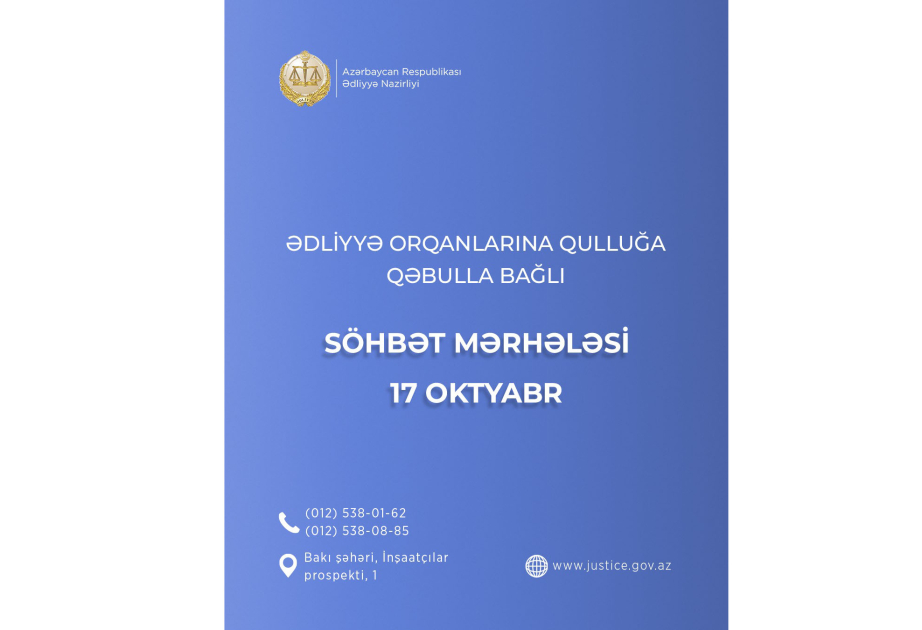 Söhbət nazirliyin inzibati binasında (ünvan: Bakı şəhəri, İnşaatçılar prospekti, 1) fərdi qaydada keçiriləcək və onun vaxtı barədə hər bir namizədə əvvəlcədən məlumat veriləcək. Qanunvericiliyə əsasən müsabiqənin nəticələrinə görə uğur qazanmış hüquqşünaslar peşə fəaliyyətinə buraxılması məqsədilə Ədliyyə Akademiyasında icbari təlimə cəlb ediləcəklər. Təlimin yekunları üzrə imtahandan müvəffəqiyyətlə keçən namizədlər qulluğa qəbul olunacaqlar.