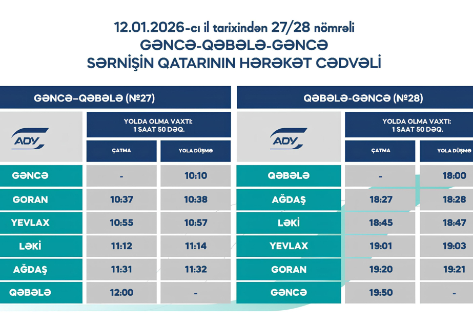 Yanvarın 12-dən fəaliyyətə başlayacaq Gəncə–Qəbələ–Gəncə marşrutu üzrə qatarların hərəkət qrafiki açıqlanıb.