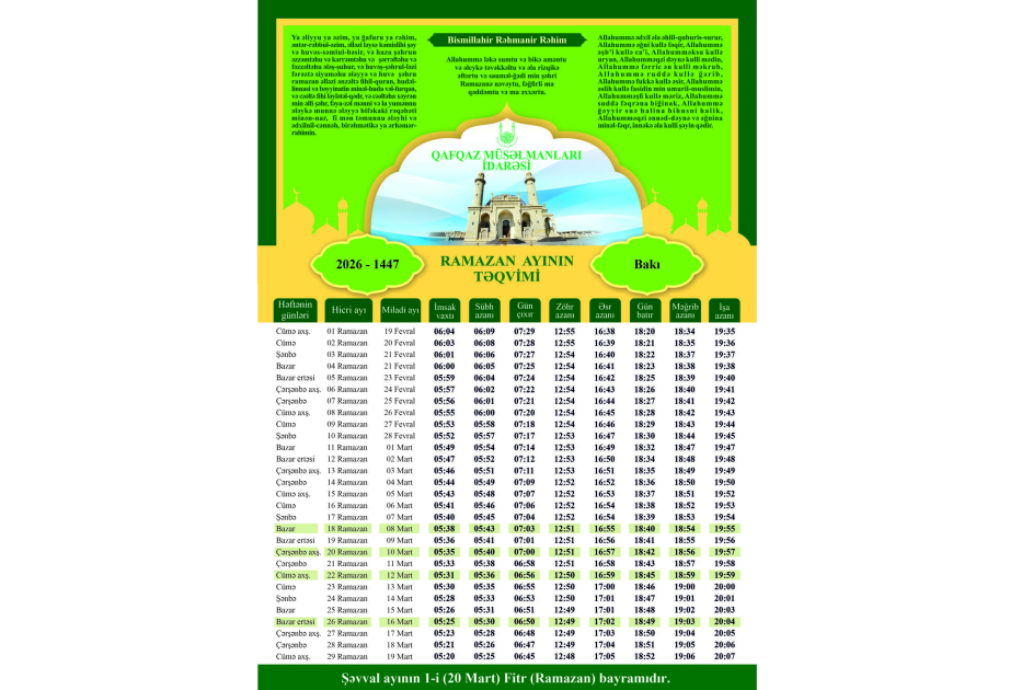 Qafqaz Müsəlmanları İdarəsi 2026-cı il üçün Ramazan ayının təqvimini elan edib.