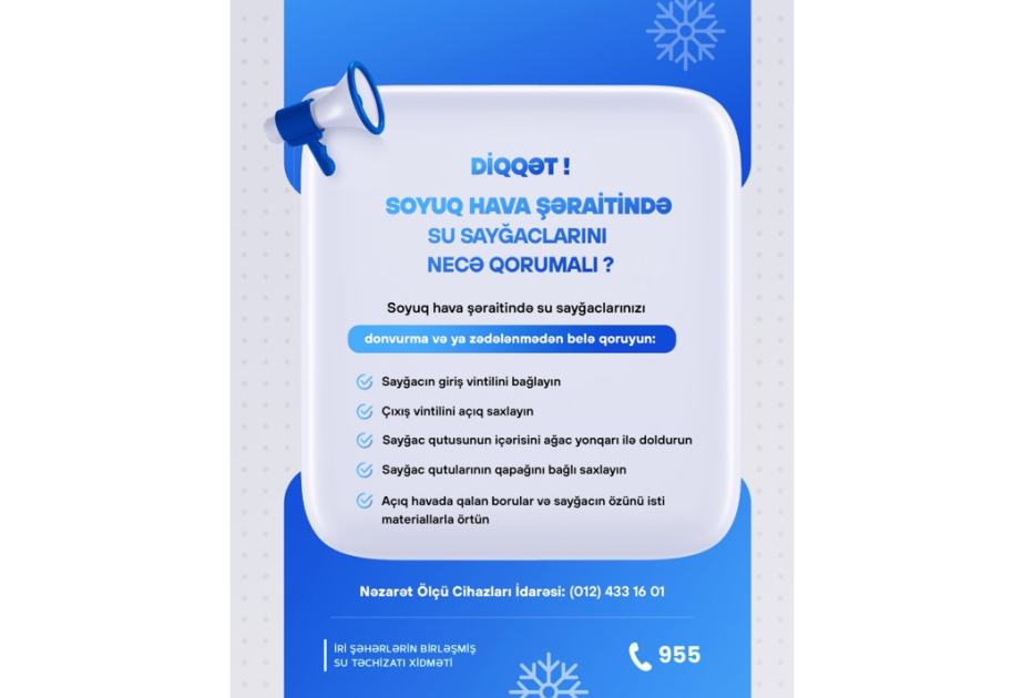 İstehlakçıların diqqətinə çatdırırıq ki, fərdi yaşayış evlərində, həyətyanı sahələrdə, kommersiya obyektlərində quraşdırılmış sayğacların şaxtalı günlərdə donvurma nəticəsində sıradan çıxmasının qarşısının alınması üçün zəruri və qabaqlayıcı tədbirlərin görülməsi vacibdir.