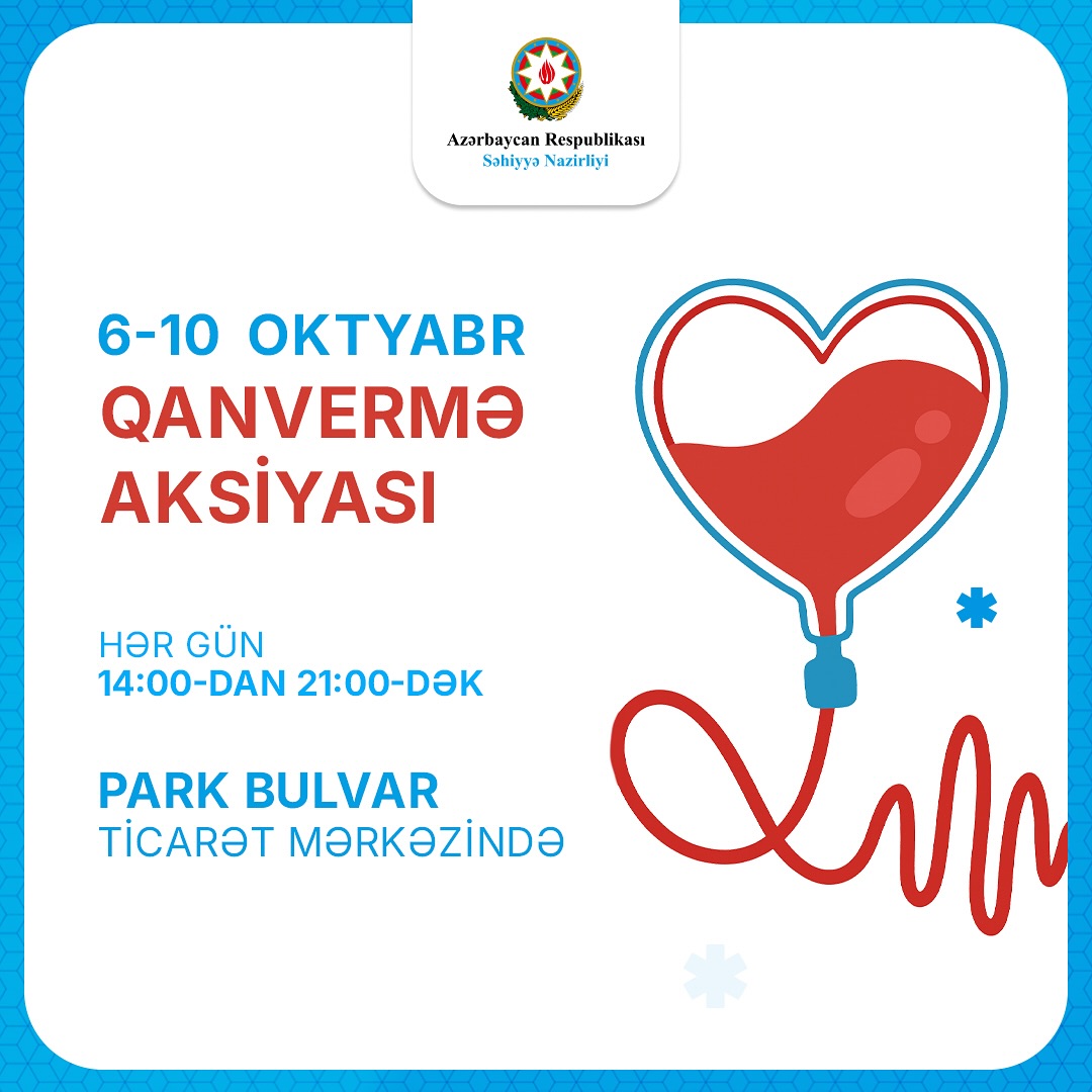 Səhiyyə Nazirliyinin Respublika Qan Bankı tərəfindən Heydər Əliyev Fondunun “Talassemiyasız həyat naminə” proqramı çərçivəsində 06-10 oktyabr tarixlərində “Park Bulvar” ticarət mərkəzində könüllü qanvermə aksiyası keçirilir.
